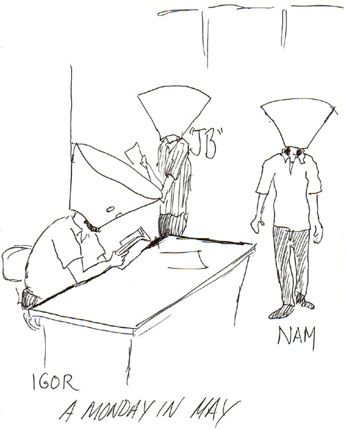Nam and Igor are trying to ignore Vova and JB doing Karaoke with a fiber optic light.