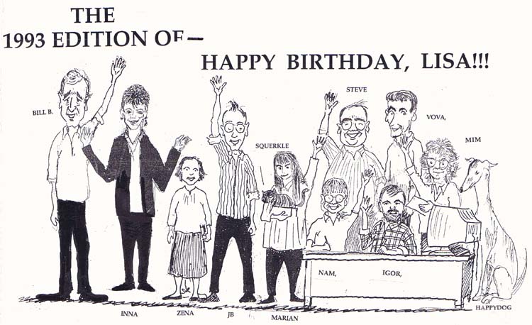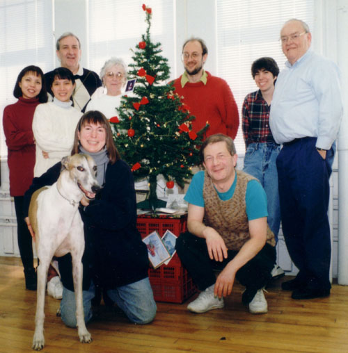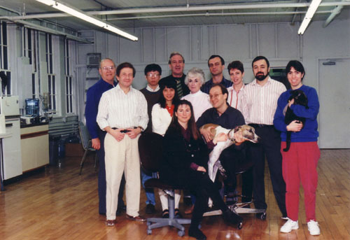 This first image was in our Millicarat engineering heyday, 1994~5.  Left-to-right were Steve - Leonid - Nam - Hai Dung - Bill - MarianD - Mim - Vova (in the rear) - JB - Happy Dog - Inna - Igor - Marian A - holding Loki the CEO (Cat Executive Officer).